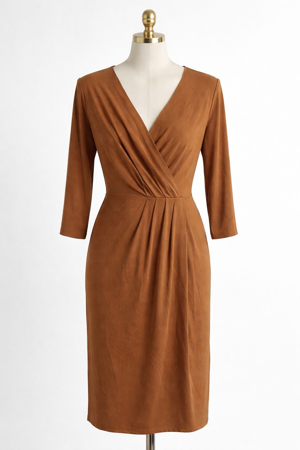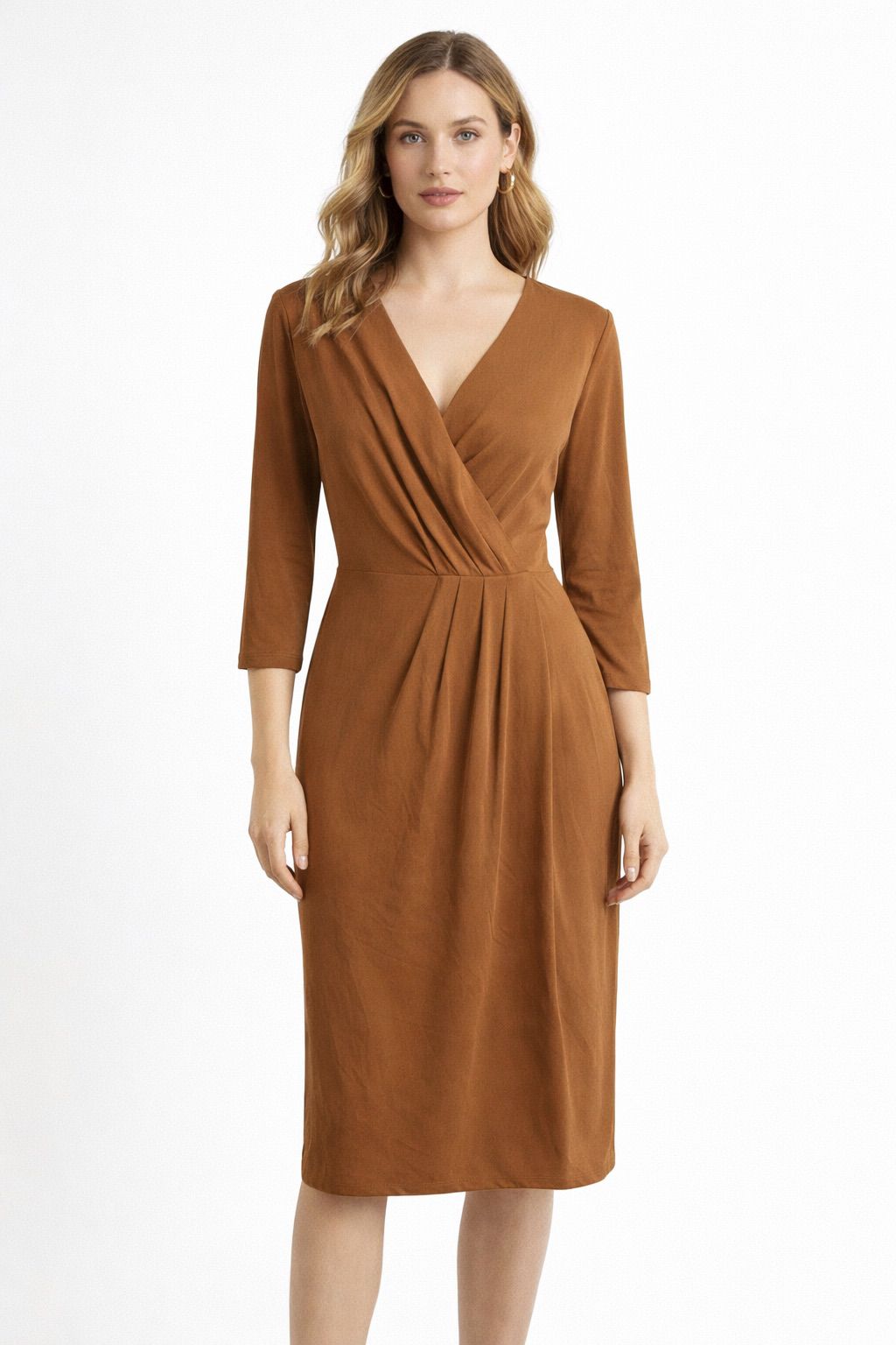 Elegancia sin esfuerzo. Su diseño con nudo frontal estiliza la figura, mientras que el tono tierra aporta sofisticación. Perfecto para la oficina o una cena especial. Lujo accesible gracias a nuestra gestión directa de stock.
